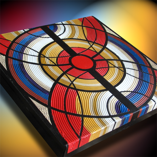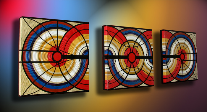 I have been an admirer of Kenneth Noland’s Targets for a very long time and decided to do a piece extending one of his targets horizontally over three panels.I painted these using a textured cell structure and underlying geometry to give continuity to the composition.