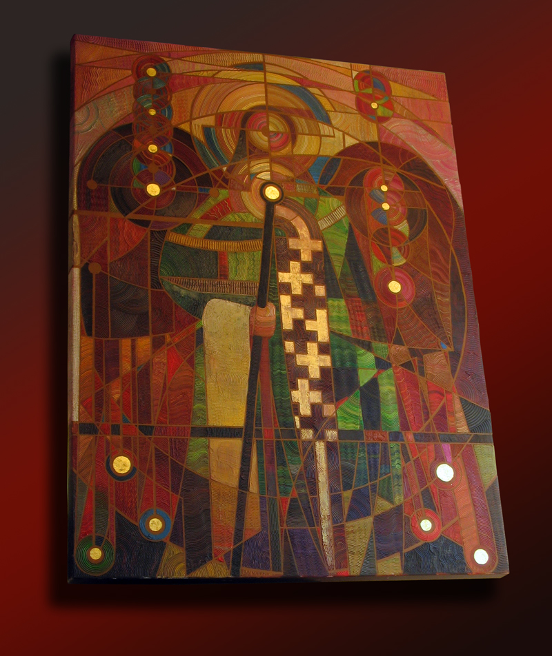This painting is a composite icon of an apostle,angel,shepherd and Christ figure combined and reinterpreted in a modern style that takes it’s basic geometry from Byzantine iconography combined with the impression that of stained glass in relation to it’s cell structure.Gold leafing was used on the highlights.This was a commissioned work and at the clients request is a little more figurative that what I am accustom to creating. All the same I am very happy with the results and being Greek in origin it was a pleasure to reinterpret something that is reflective of the culture that I was raised in