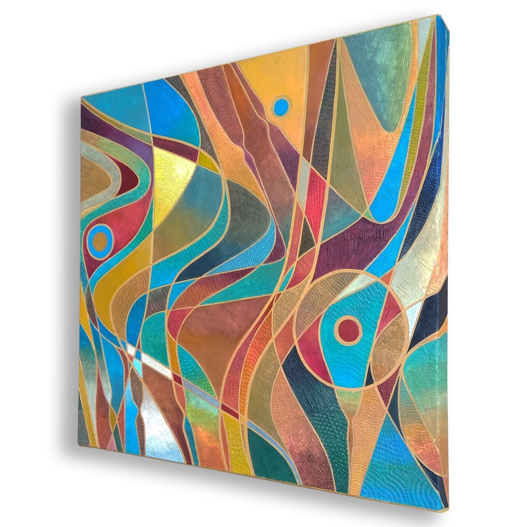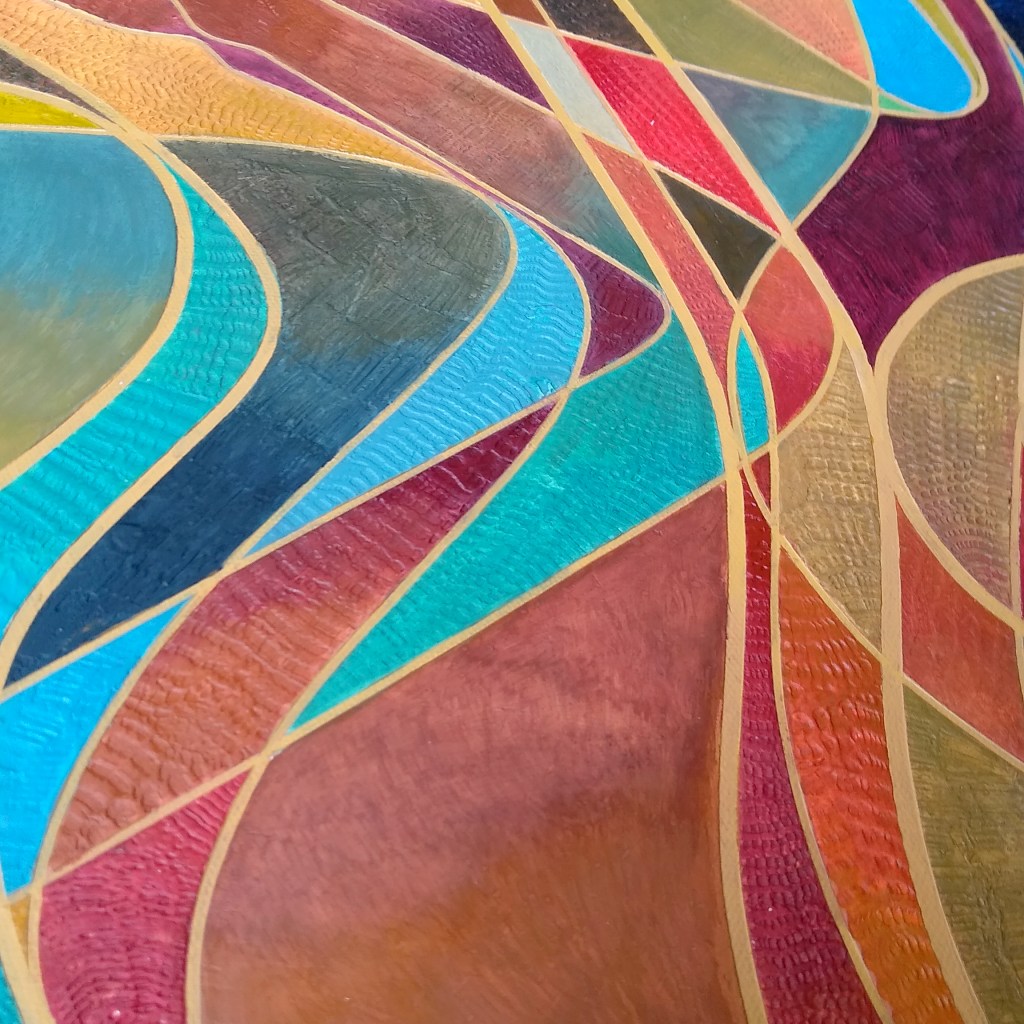 This composition juxtaposes saturated colors with earth tones reminiscent of Minoan Fresco.Each cell of the composition is individually and uniquely textured and there are color gradients side by side with solid colors. The idea is to produce a modern graphic composition that also has relief and gradations contradict the uniformity of the free form composition and are a reminder of classical practices and technique in painting.