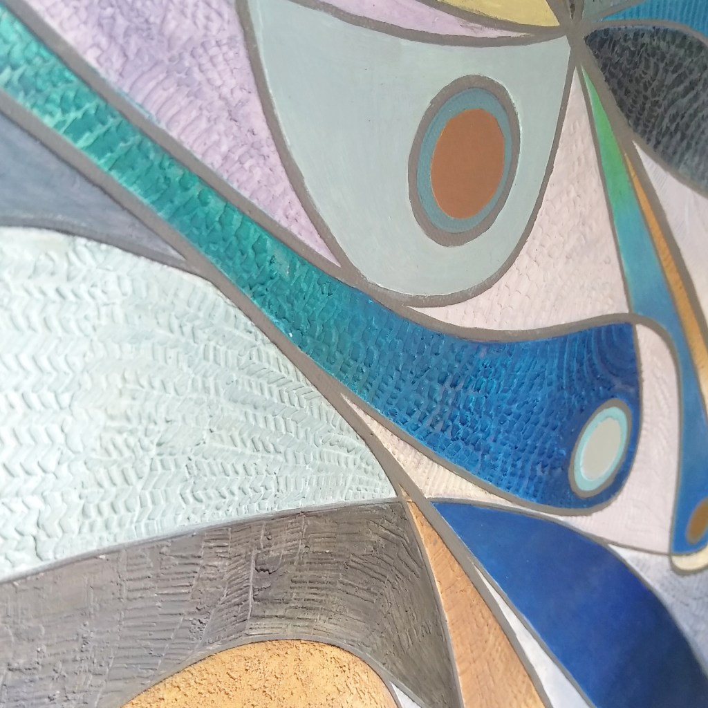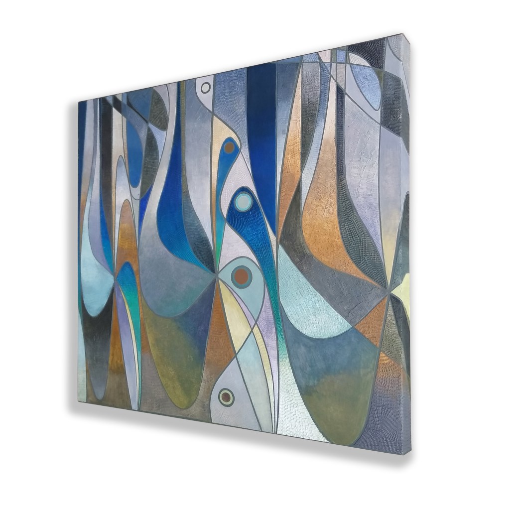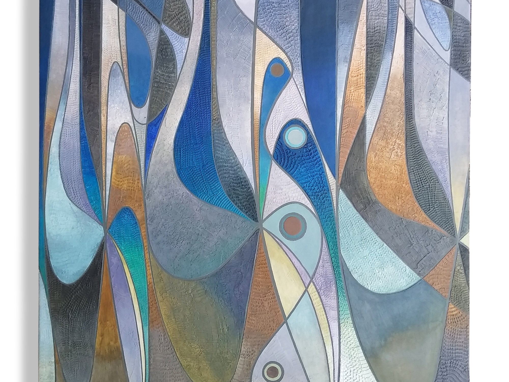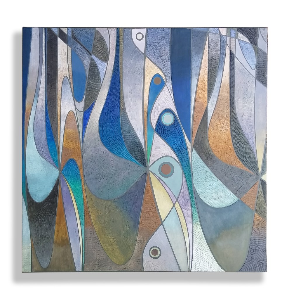 đź”´SOLD24″X 24″ X 2″ Acrylic and Modeling paste on Canvas. This is a composition of slate grey and blues (colors evocative of a storm) .Th composition is of three pinwheels at different frequencies and expanding and contracting.