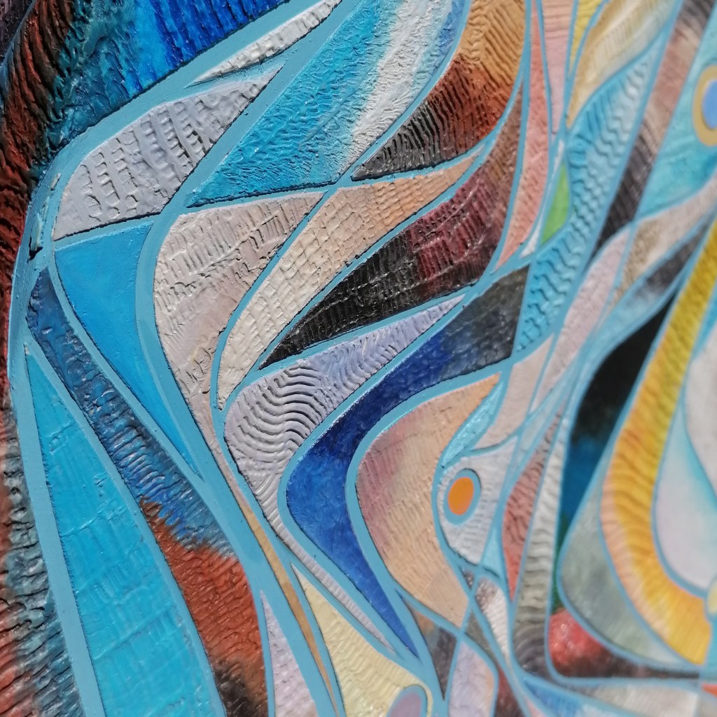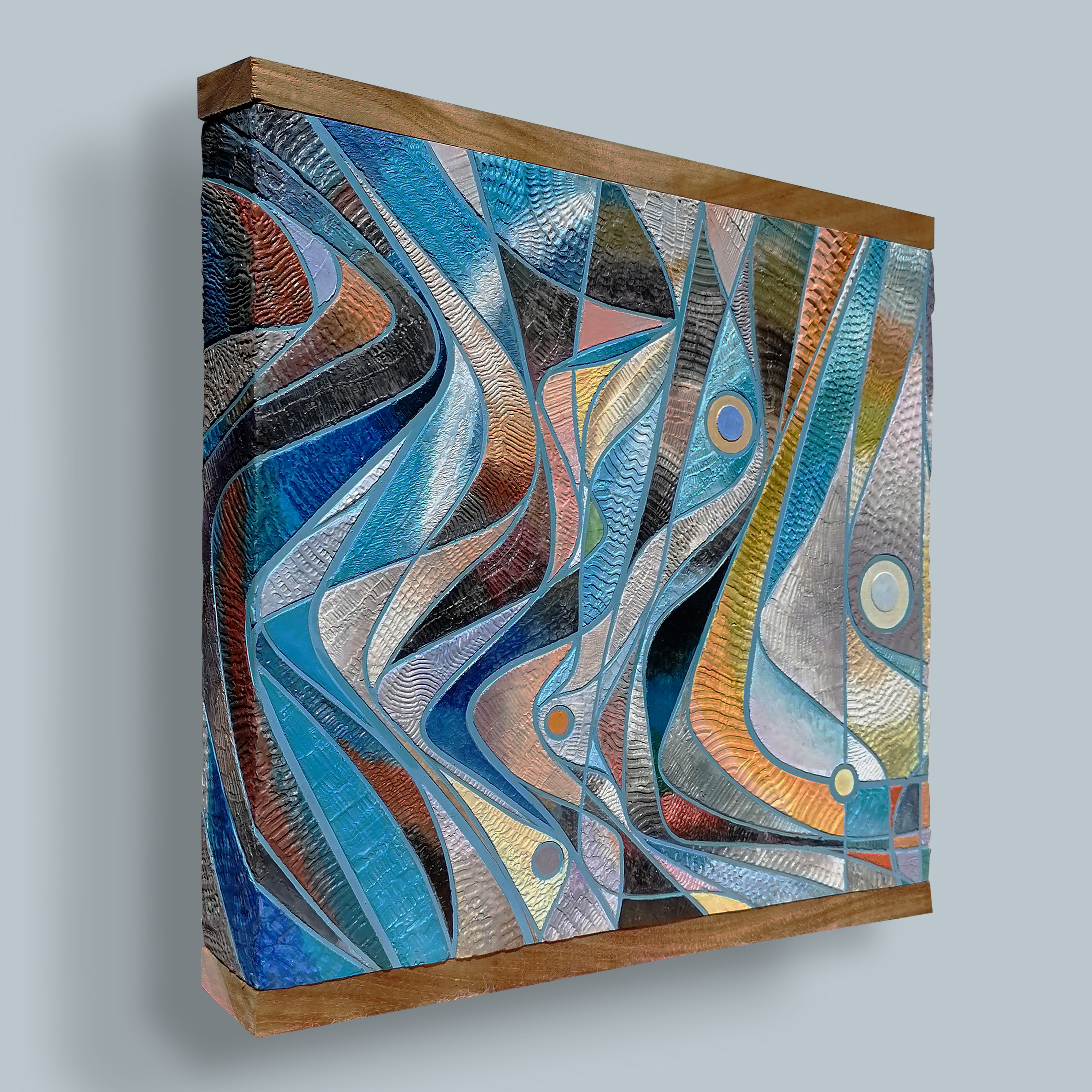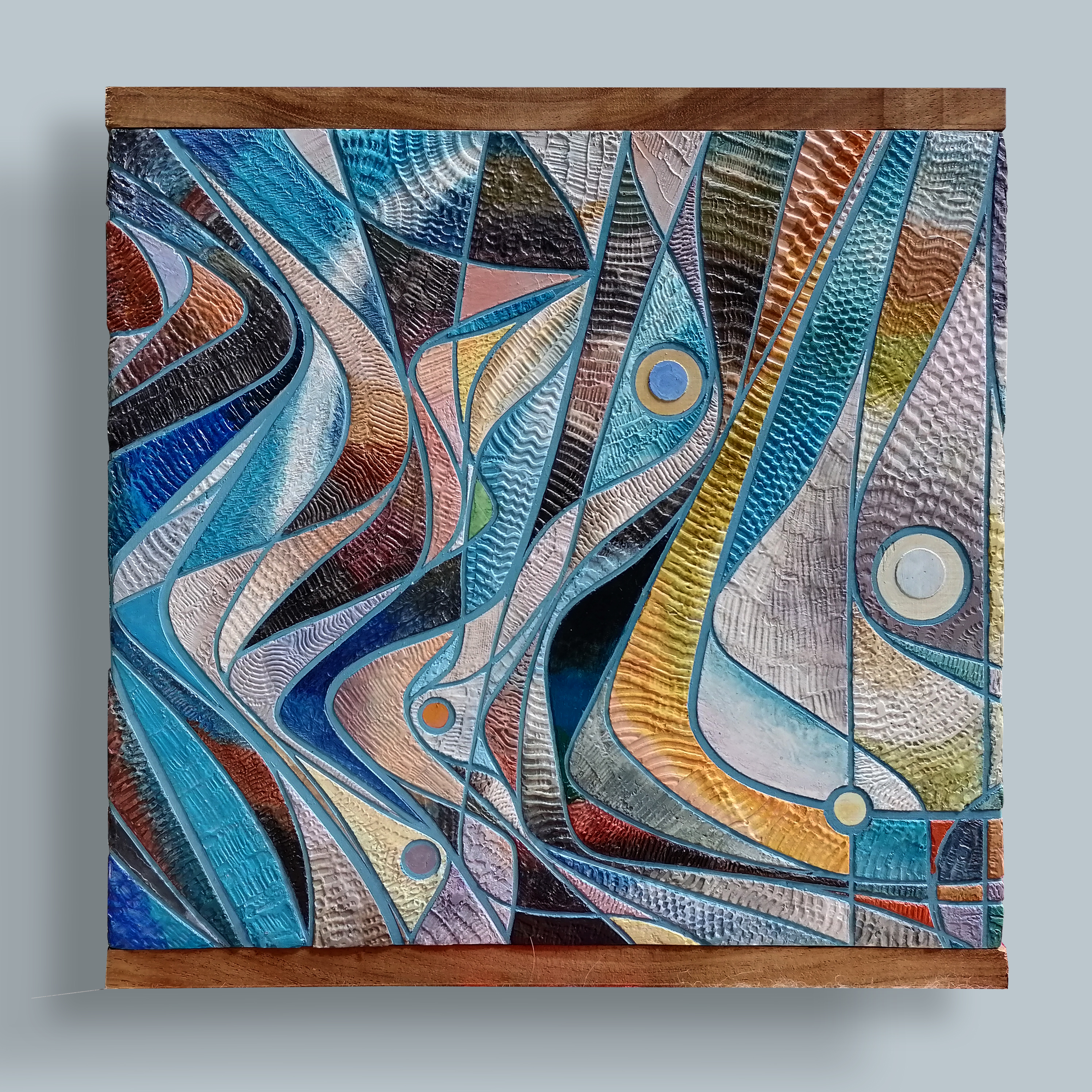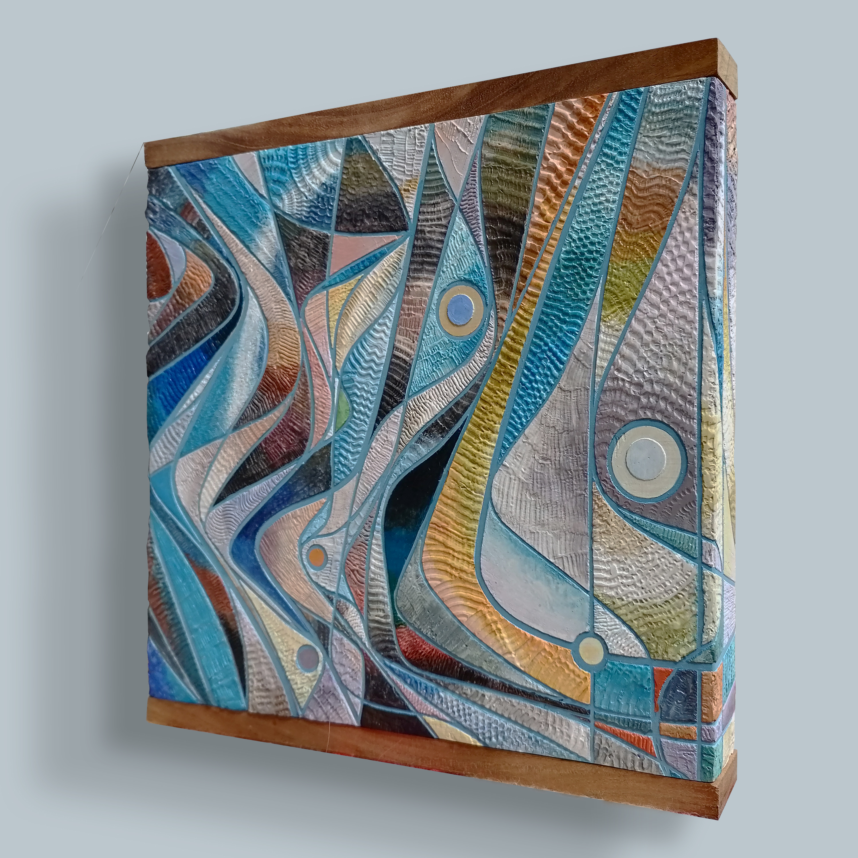 11″X11″ Acrylic and modeling paste on cypress panel frames with teak caps. May is a representation of a the birthstone of the titled month. Was surprised to come across examples that warranted making a composition from.