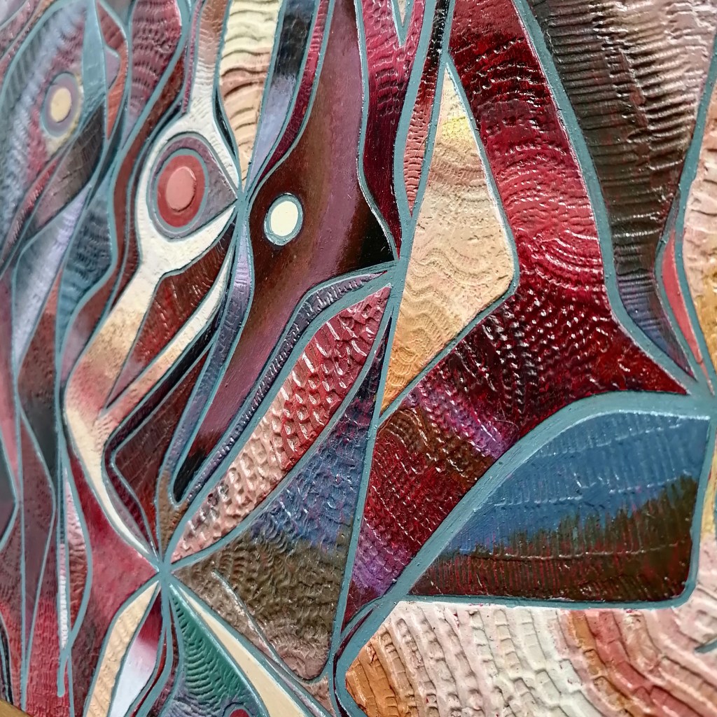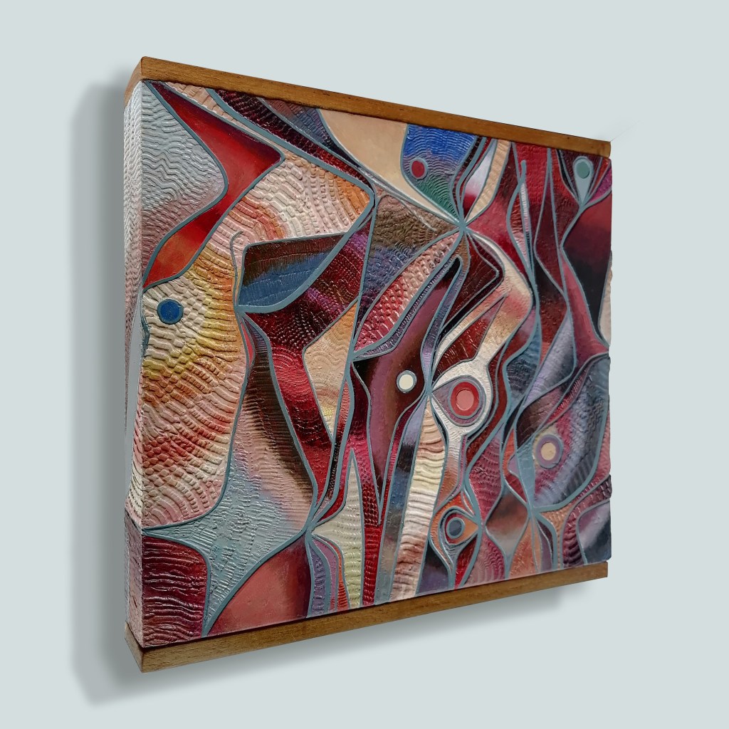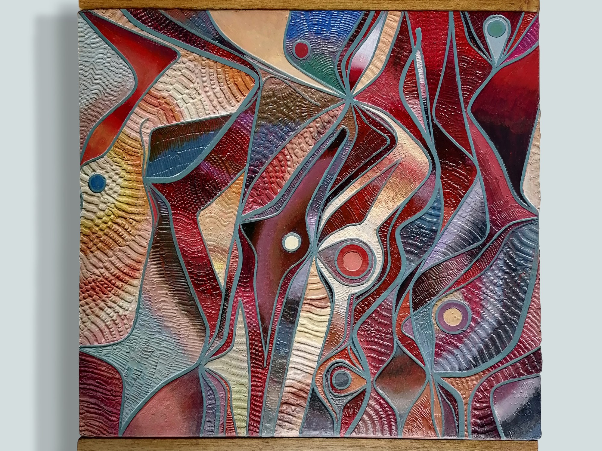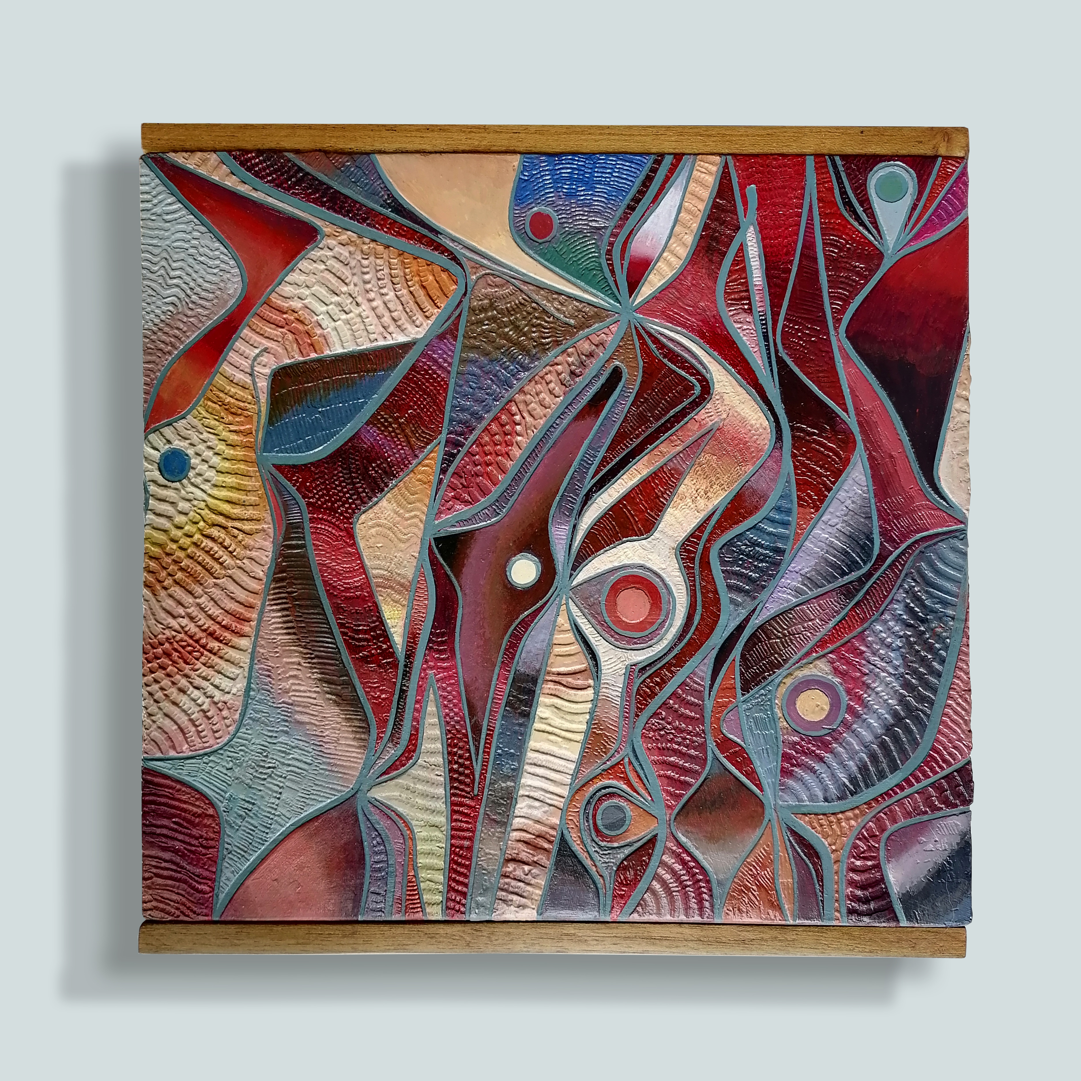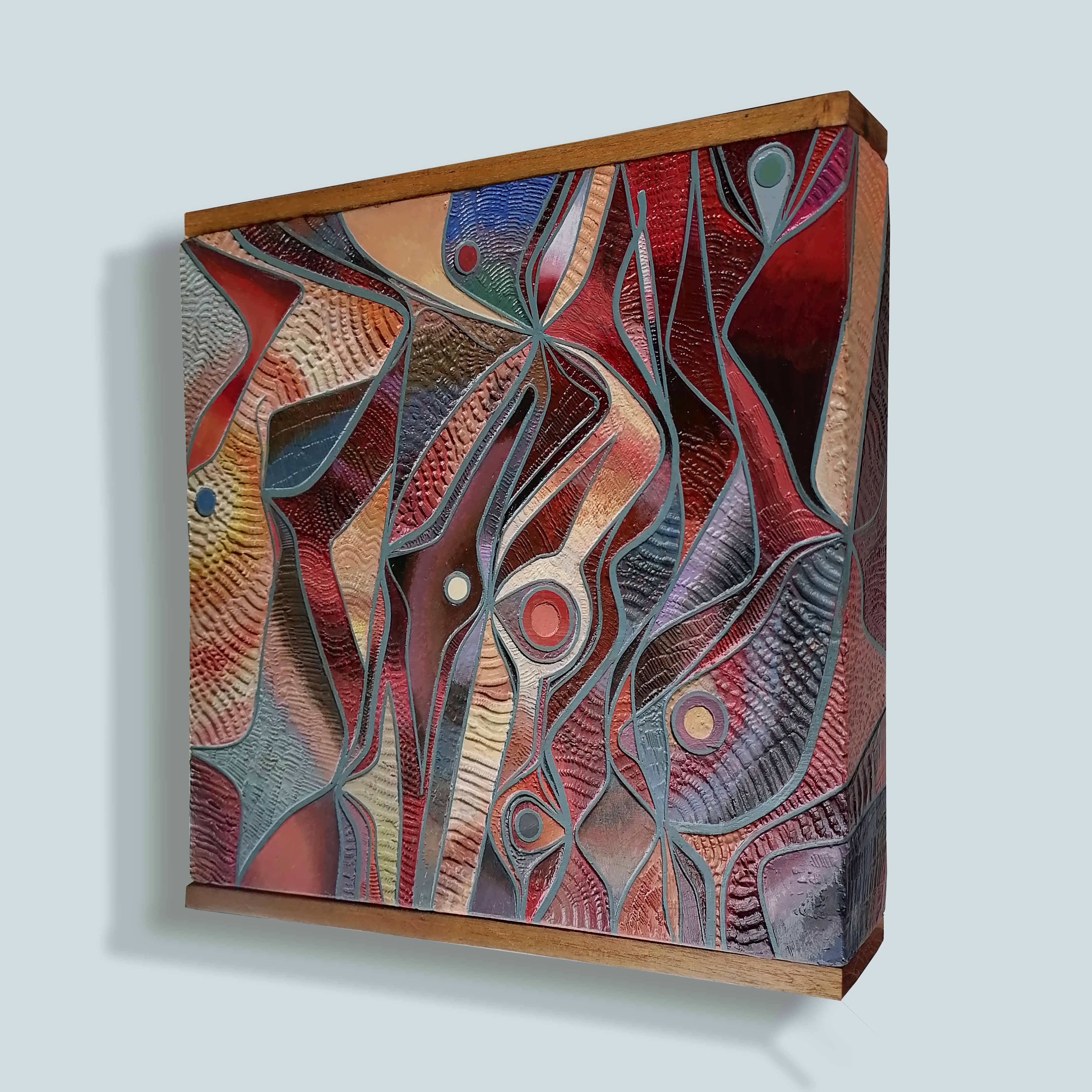 🔴SOLD Red onyx no. 1 12″X12″X1.5″ acrylic and modeling paste on cypress panel with teak caps. Free form composition based on Onyx stones using offset splines and topography like geometries. 1 of 4 in series.