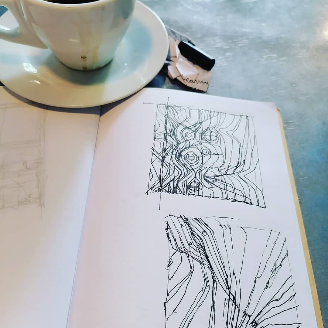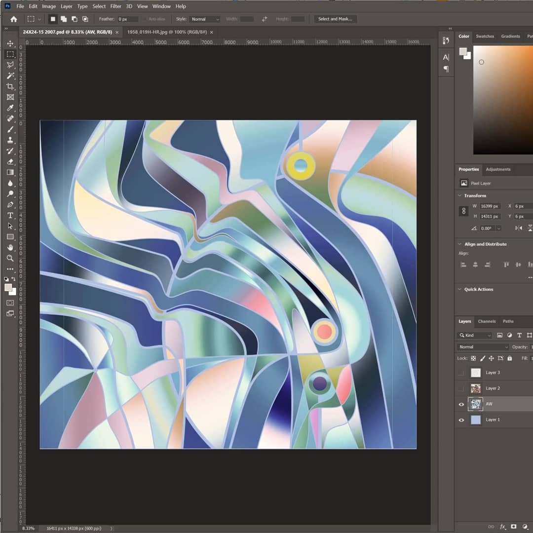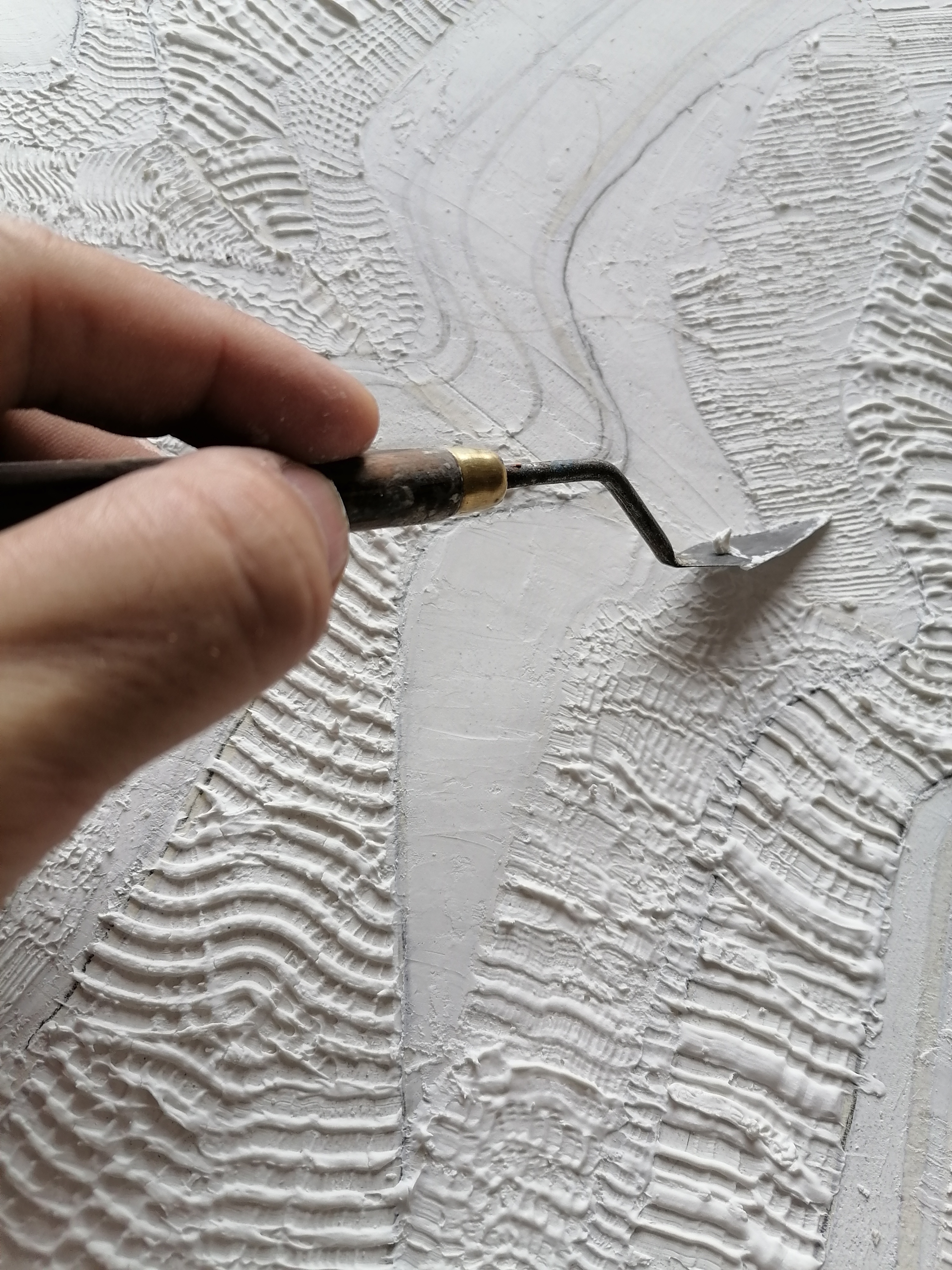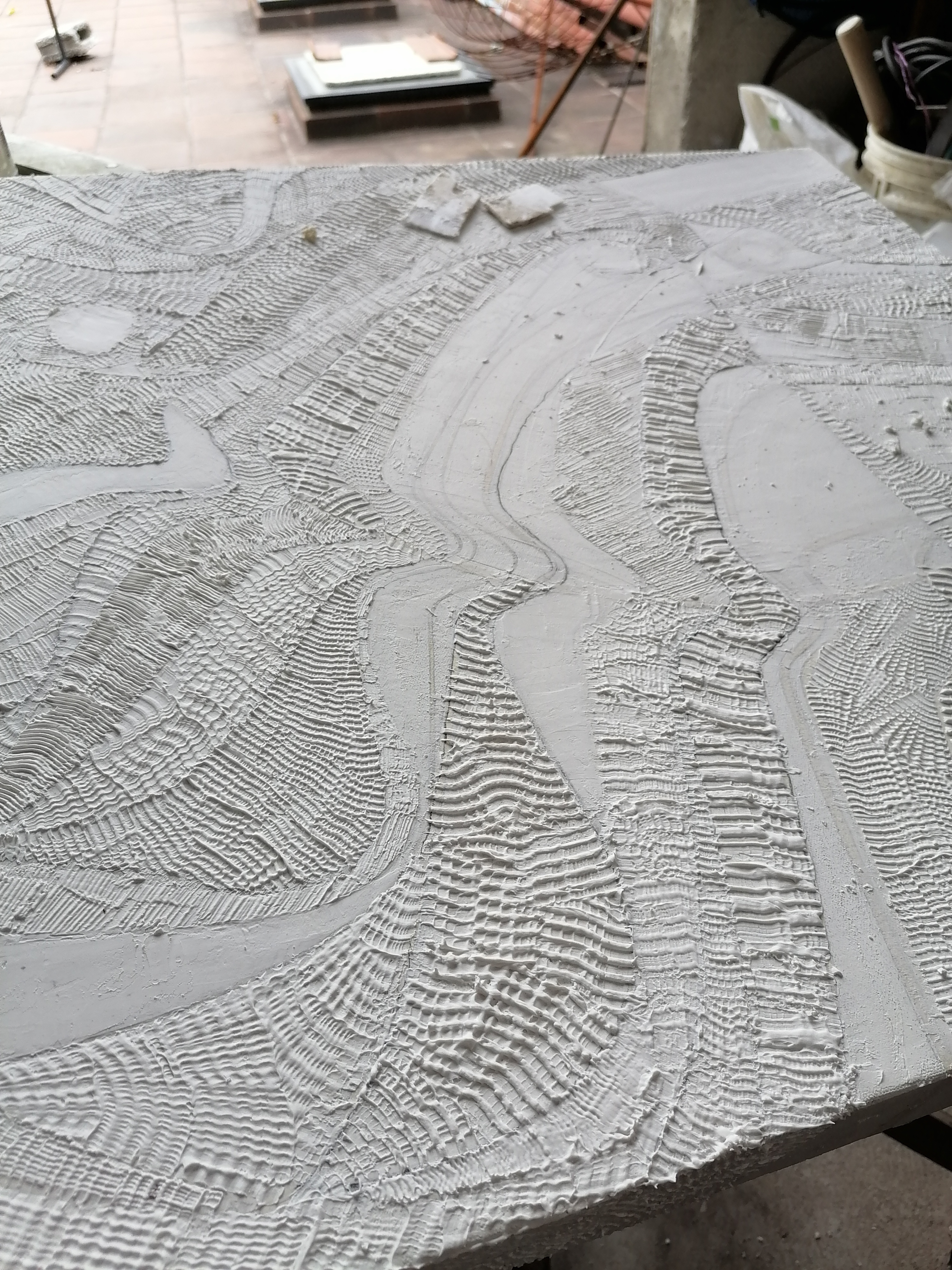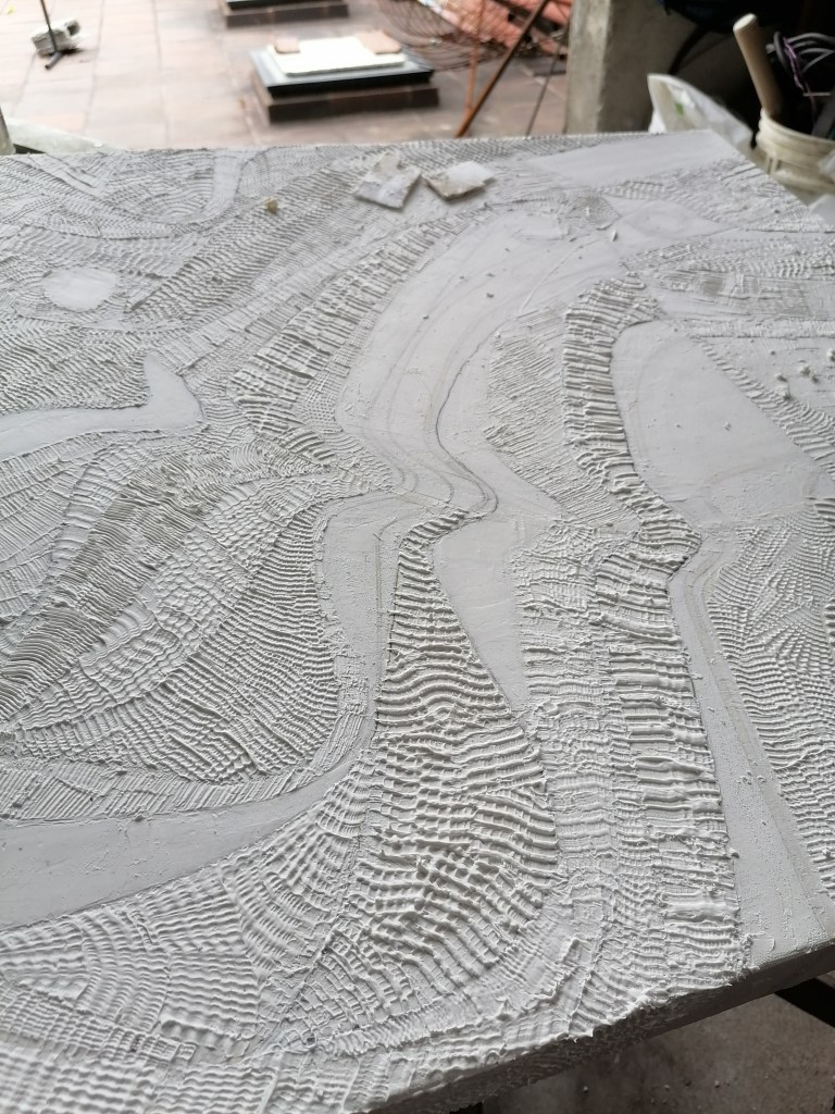 Lately (2018), many of the paintings have been integrating references to nature. The extensive use of waves’ topographies and geological forms has led, in the final work, to gradations and offsets of lines and forms progressing through space. The color palettes of slate, agate and sandstone play a role, incorporating saturated colors into the compositions to give them syncopation and rhythm. The textures add a relief that separates the image from its graphic origins and reflects a more complex interplay with the lighting as it constantly shifts throughout the day.